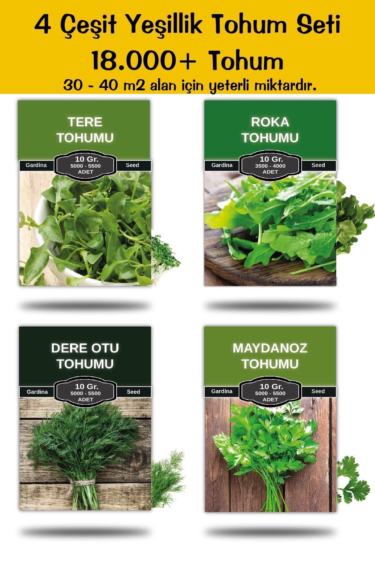 Mini Boy 4 Çeşit Yeşillik Tohum Paketi Maydanoz , Roka , Tere , Dereotu Toplam 40gr. 15.000 Tohum STOH40GR, one size