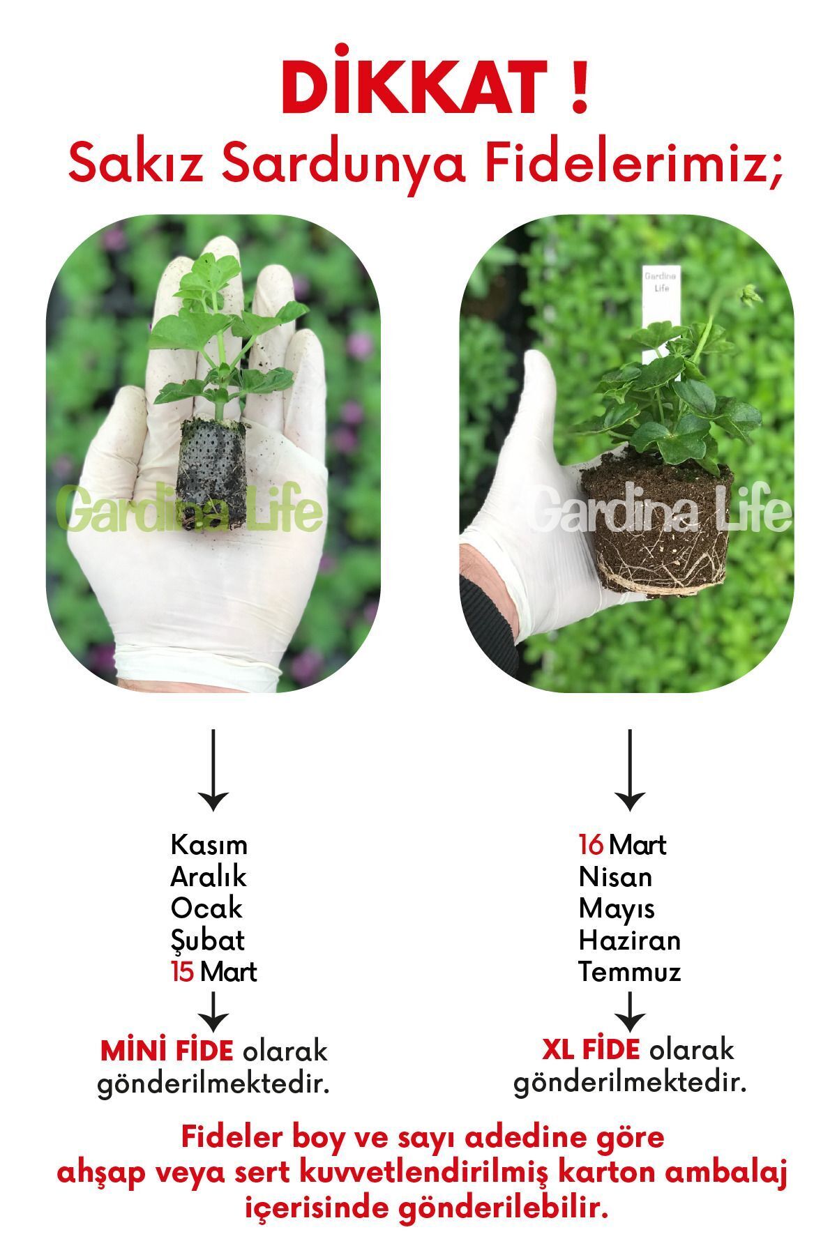 ; Paket İçeriği 1 Adet Fide ; Sarkan sardunya türüdür, parlak renk yapraklara göz alıcı çiçeklere sahiptir.; ; İthal Fidedir.; İri çiçekli olup, küresel formda gelişirler.; ; Soğuklara ve kısa süreli donlara dayanıklıdırlar.; 4 - 8 Dereceden Daha soğuk iklimlerde içeride bakılmalıdır.; ; Çok yıllık kalıcı sardunyalardır.; ; Sardunyalar verimli toprak sevdiklerinden mutlaka her bahar başı toprakları zenginleştirilmelidir.; Saksı yetiştiriciliğinde bahar ve yaz boyunca düzenli gübreleme yapmak çiçeklenmeyi artırır.; ; Güneşli veya yarı gölge alanlarda konumlandırılmalıdır.; İç ve dış mekanda bol güneş alan aydınlık konumda bakılmalıdır, ; Normal veya sarkan makrome saksılarda yetiştirilmeye uygundur.; ; Geçirgen yüksek verimli toprak, İle Torf karışımına dikilmelidir.; ; Dikim: FİDEERİN KÖK KISMINDA BULUNAN ( paper pot ) TÜL BENZERİ BEZİ SÖKMEYİNİZ.; Fideler elinize geçer geçmez, içi verimli, hafif toprak torf karışımı ile dolu saksılara dikimini gerçekleştirin.; Fideleri asla bekletmeyin ve çiçeklenmesini istediğiniz ortalama 15-20 cm çaplı saksılara dikiniz.; ; Saksıları TAM DOLDURUNUZ.; Fide Dikimden sonra saksıyı mutlaka derinlemesine ve bol suyla sulayınız.; Bu ilk sulama çok önemlidir ve asla atlanmamalıdır.; ; İç mekan yetiştiricilikte bol ışık alan aydınlık bir yere yerleştirin.; Geçen çiçeklerini uzun süre üzerinde tutmayın zira bitkiyi zayıflatırlar.; Bahar ve yaz döneminde düzenli gübreleme yapınız.; ; Sulama: Saksı toprağı üstten 2 parmak kurumaya başlayınca yapılmalıdır.; ; Düzenli sulama ( 2 günde bir 3 günde bir gibi) YAPMAYINIZ, saksılarınızı toprak kurumaya başladıkça sulayın.; ; Gübre veya Bitki besini : Fide dikiminden önce toprak harcına ölçüsünde karıştıracağınız bir kaşık akıllı gübre sezon boyu bitkiyi besler.; ; Fidelerimiz son derece sağlıklıdır.; Bitkinin tutup tutmaması tamamen sizin sağlayacağınız bakım şartlarına bağlıdır.; Sıcak yaz Dönemlerinde Cumartesi ve pazar güneri ürünlerin kargoda beklememesi için çıkış yapmamaktayız.; Çeşitlerimiz Dikime uygun Dönem / Mevsimlerde satışa açılmaktadır.